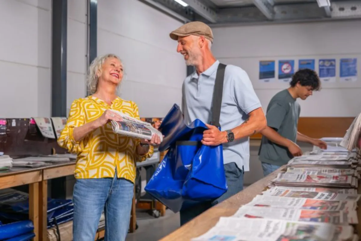 Slider image Krantenbezorgster stopt krant in brievenbus
